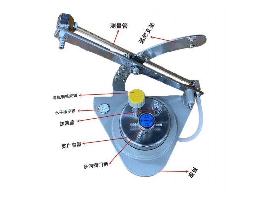 2.旋開正力容器上的加液蓋,緩慢加入密度為0.810克/立方厘米的酒精,(95%的酒精)使其液面在傾斜測量管上的刻線在零點附近,然后把加液蓋旋緊,將閥門撥在“測壓”處,用橡皮管接在閥門“+”壓接頭上,用壓氣球輕吹橡皮管,使傾斜測量管內(nèi)液面上升到接近于頂端處,排出存留在正壓容器和傾斜測量管道之間的氣泡,反復(fù)數(shù)次,直至氣泡排盡。
