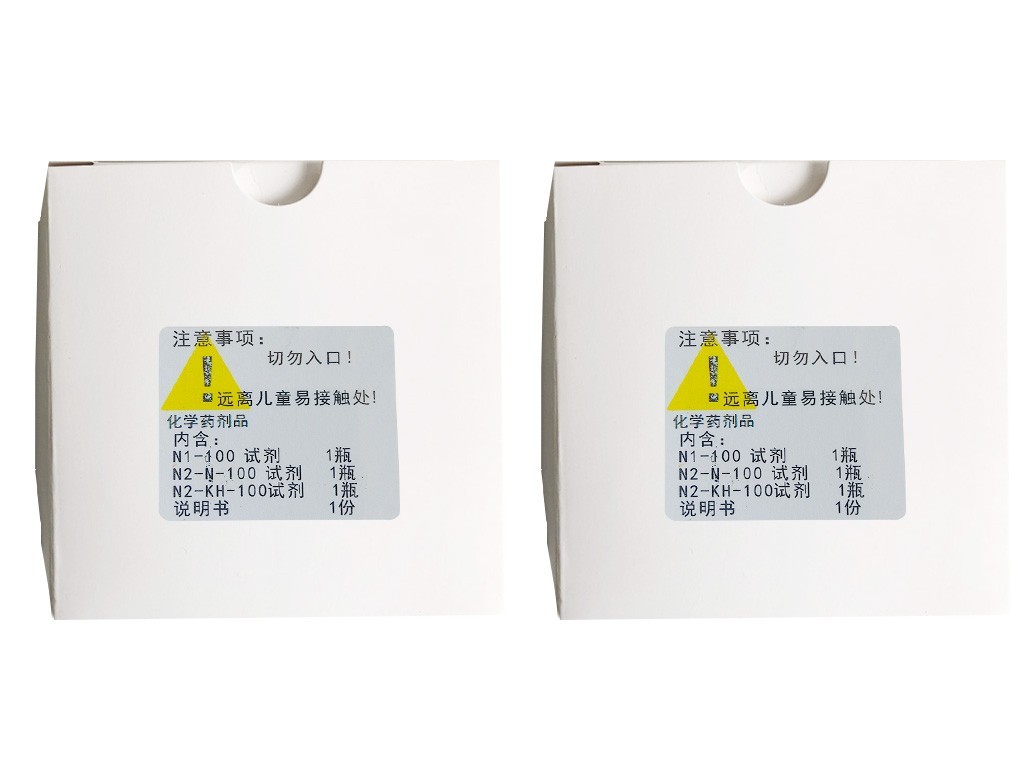 將整瓶片狀N2—N倒入燒杯中,加入50ml無氨水,攪拌溶解,充分冷卻至室溫。另將整瓶N2—KH粉末試劑全部倒入燒杯中,加入10ml無氨水,攪拌使其充分溶解,然后將此溶液在攪拌下徐徐注入充分冷卻的N2—N溶液中,用水稀釋至100ml,靜置5個小時以上,小心倒出上清液待用。此溶液儲存于棕色聚乙烯瓶中,用橡皮塞或聚乙烯蓋蓋緊,低溫冷藏儲存。如發(fā)現(xiàn)有大量沉淀或試劑顏色變深,對測定結(jié)果有很大影響,應(yīng)重新配制。